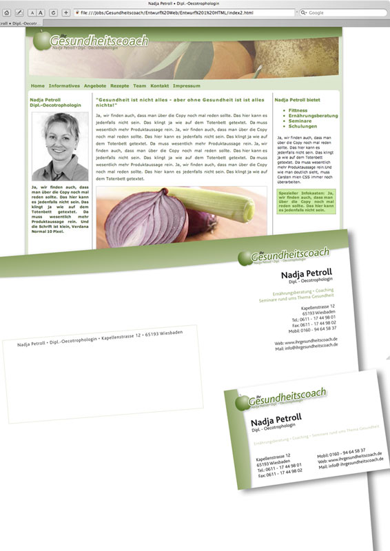 Für eine Gesundheitsfirma entstanden hier ein komplettes Corporate Identity, das sich nun auf Briefbögen, Visitenkarten, Flyern und auf der Webseite der Firma wiederfindet. Für Vorträge wurden zudem Chartvorlagen erstellt.