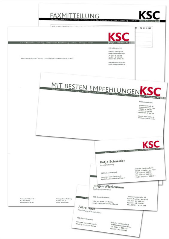 KSC - Katja Schneider Constructions ist ein Konstruktionsbüro in Frankfurt am Main mit Schwerpunkt auf Planung und Entwicklung moderner Gebäudetechnik. Hier entstand ein komplettes Corporate Identity mit Anwendung auf Geschäftsausstattung und Beschilderung.